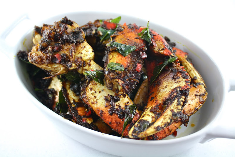 Then add the coarsely ground black peppers, dark soy sauce, and oyster sauce, sugar and give the mixture a quick stir. Mix in the crabs and stir until well combine and season with salt if necessary. Serve immediately.