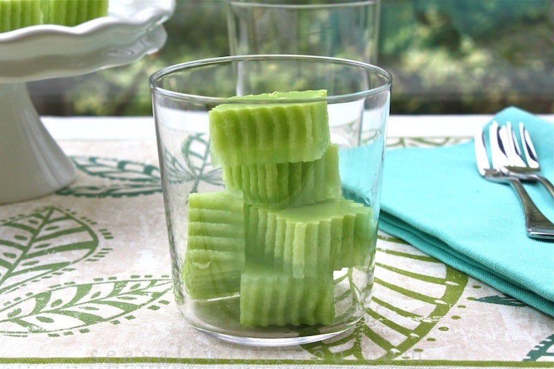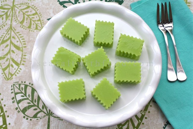 In a bowl, mix together the pandan juice and coconut milk. Then pour into the simmering agar-agar mixture, stirring constantly until the mixture come to a boil. Once it reaches a rolling boil, take the pan off the heat immediately and pour contents into a shallow glass dish of cake tin measuring approximately 16 cm (6 ½ inches) across. Set aside to cool before chilling in the refrigerator. Cut as desired and serve chilled.