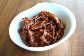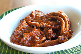 This is my recipe for the Sambal Sotong Kering or Dried Cuttlefish Sambal. These dried cuttlefish are usually available at any Asian or Chinese grocers. It has to be soaked in water for at least 24 to 36 hours before cooking. However, here, I had used presoaked cuttlefish that was conveniently available from a seafood store in Chinatown.